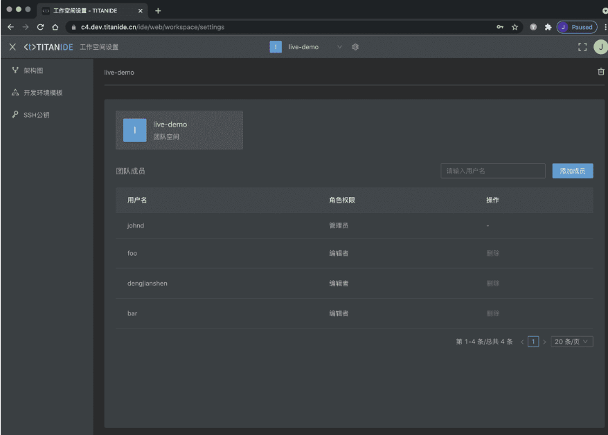 TitanIDE 支持将工作空间赋权,开启结对编程;